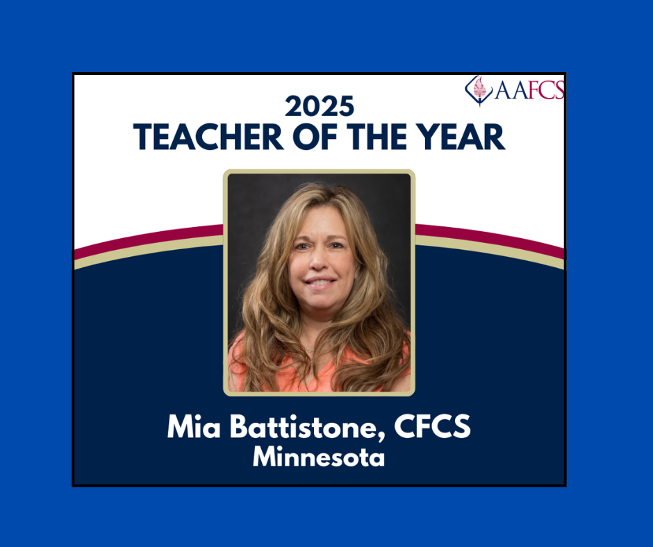 MAFCS Teacher of the Year Mia Battistone, CFCS is the 2025 American Association of Family and Consumer Teacher o the Year!