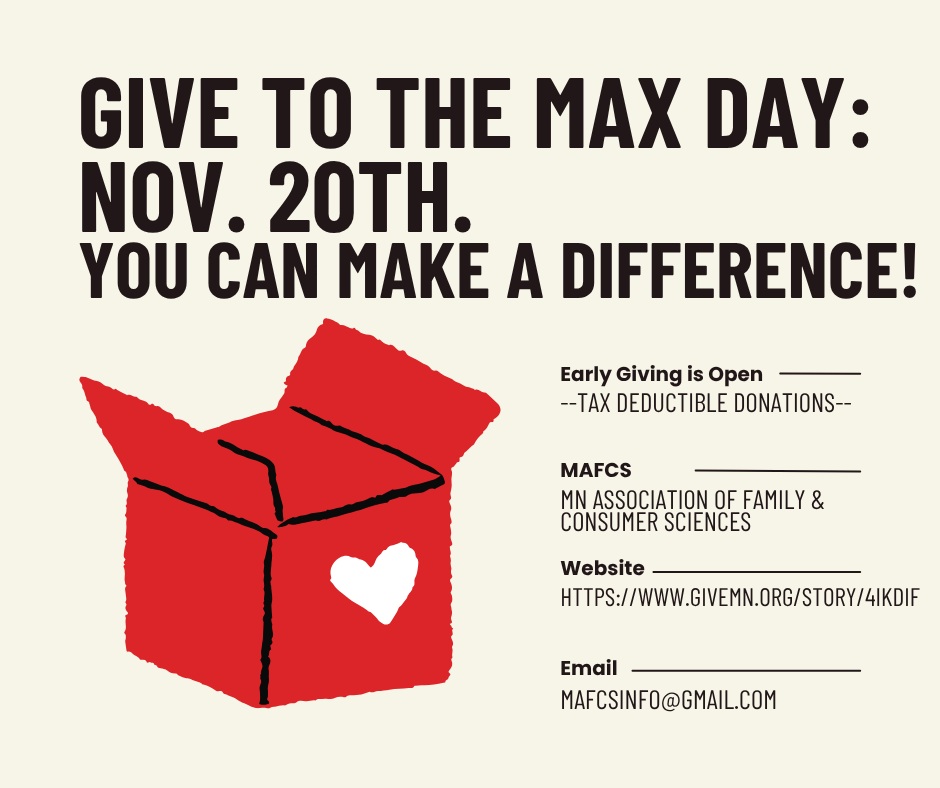 November 20, 2025 is Give to the Max day! You can help make a difference through your generous (tax deductible) donation to the Minnesota Association of Family & Consumer Science (MAFCS).